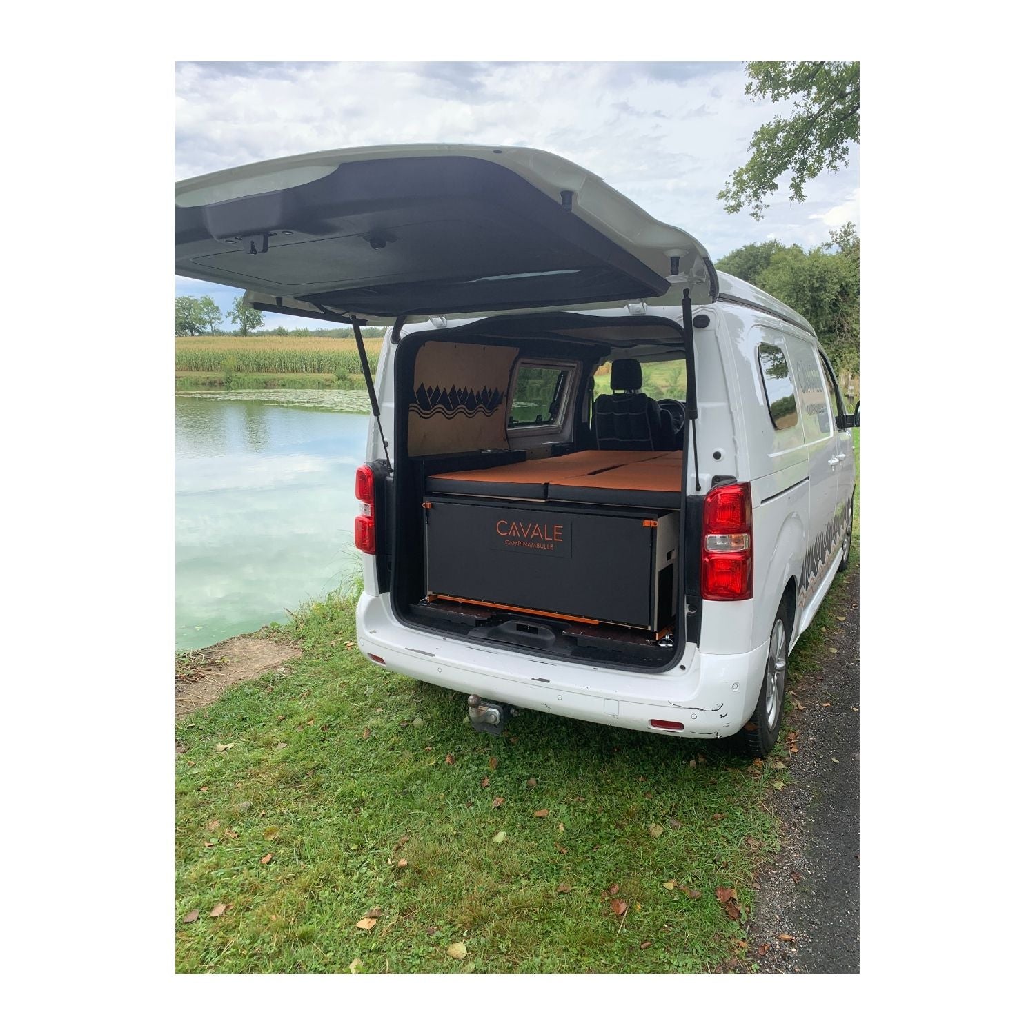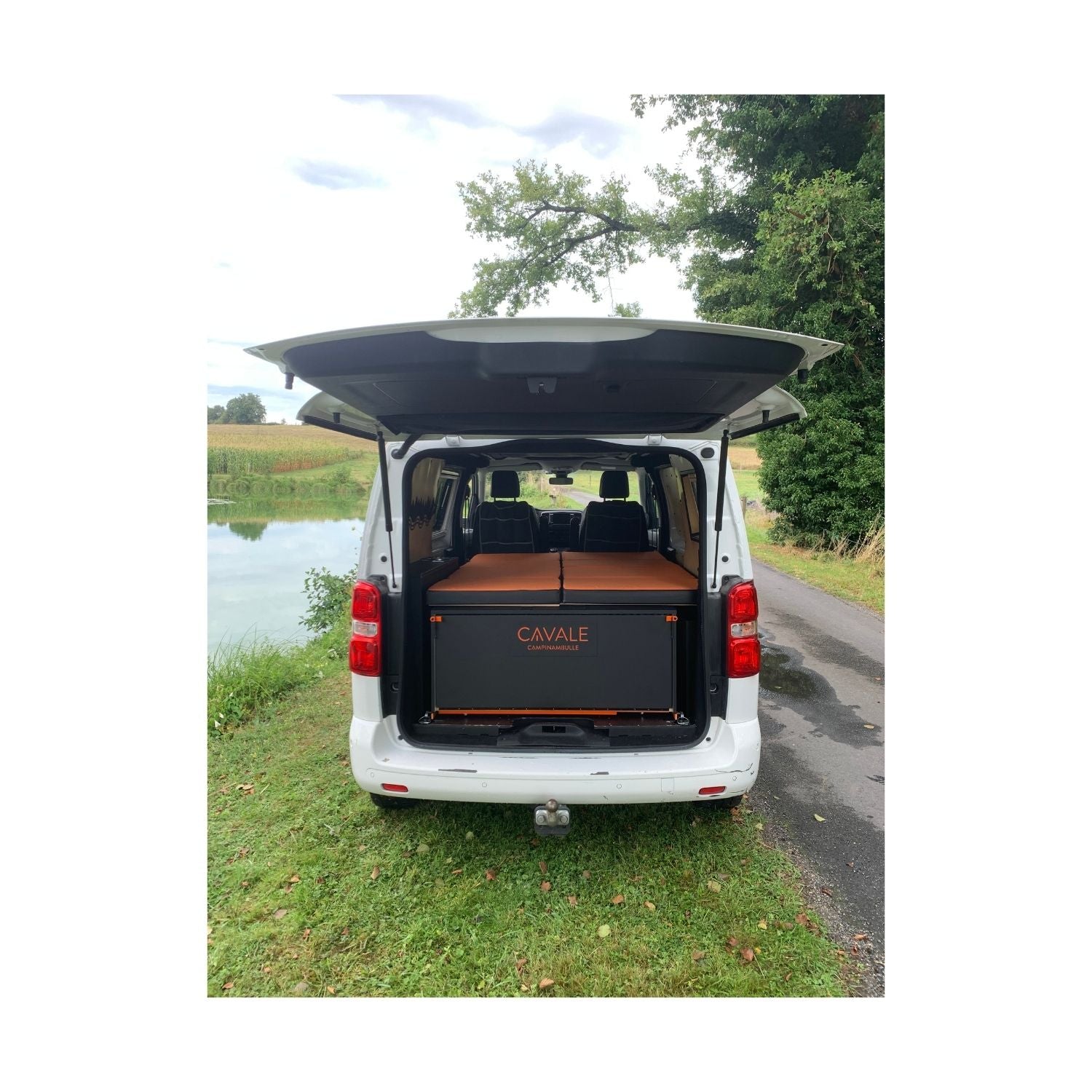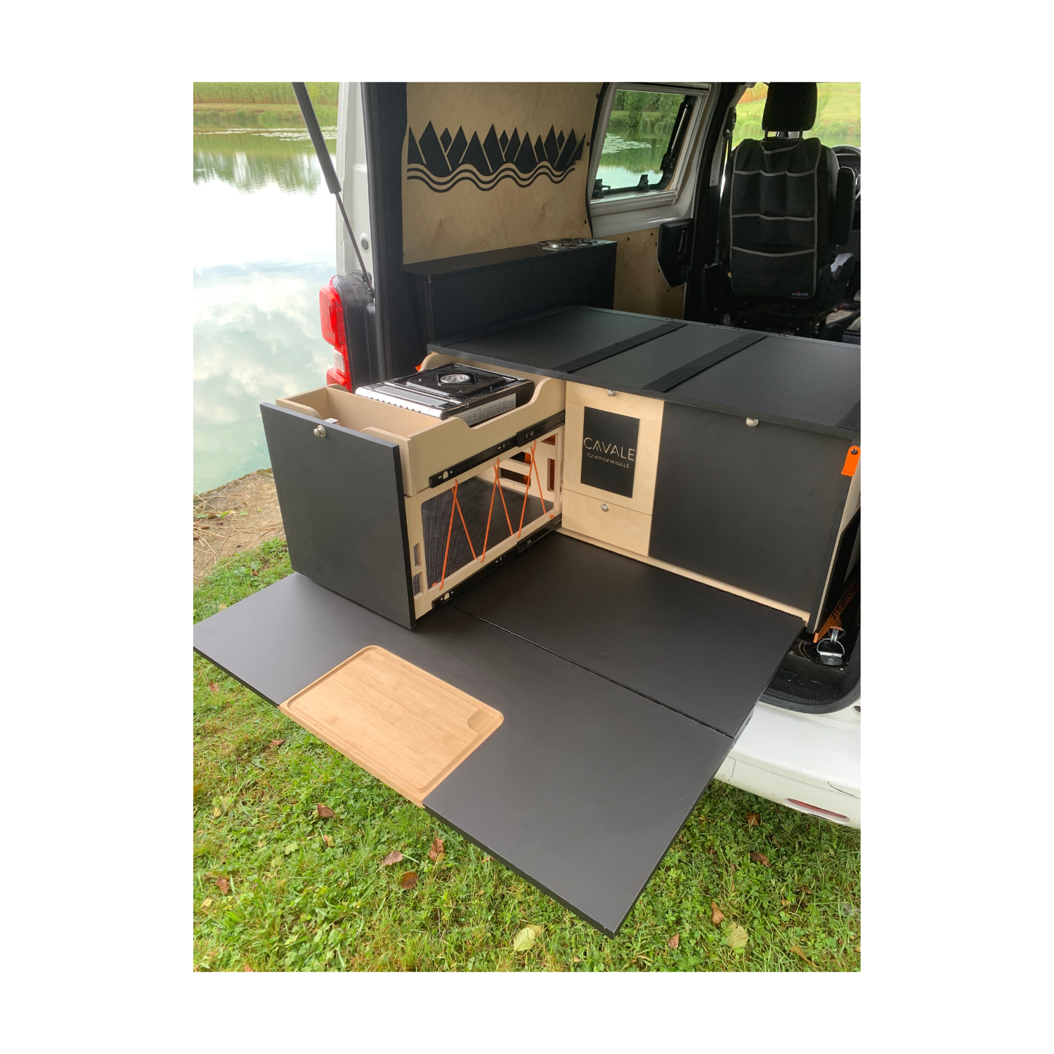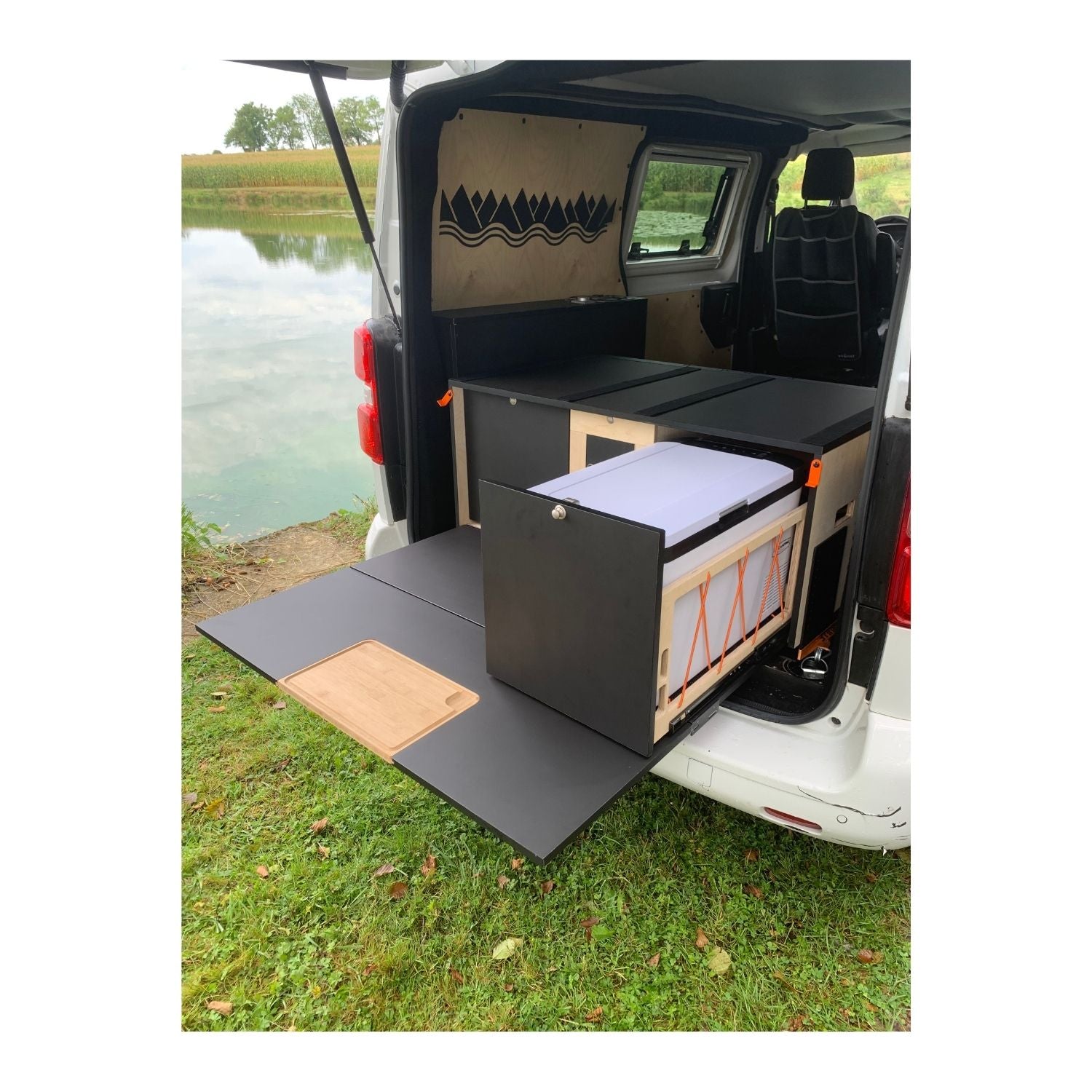Découvrez notre malle de voyage modulable. Adaptée à vos besoins et à vos envies, elle s'intègre parfaitement dans le coffre de tous les ludospaces, vans et fourgons, tout en conservant les 5 places assises. Vous avez la liberté de choisir : conservez, ou retirez le compartiment du milieu ou celui de droite selon vos besoins. Personnalisez votre expérience avec nos options variées : un tiroir frigo pour garder vos aliments au frais, une couchette confortable pour vos nuits, un point d'eau pratique ou encore une glacière à insérer à la place du compartiment de droite. Conçue pour les voyageurs en solo ou en famille, cette malle représente la liberté de personnaliser vos voyages avec style et fonctionnalité.